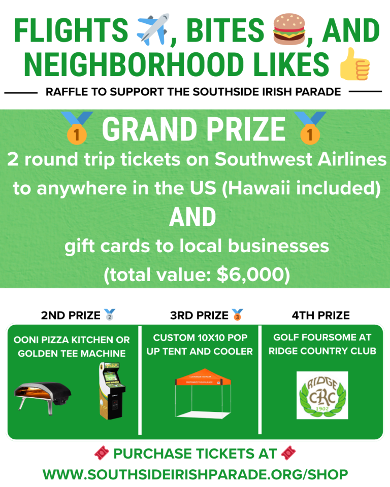 2025 Half Way to Parade Day Golf RaffleDon Larisey2025-09-09T11:29:45-06:00 "Flights, Bites, and Neighborhood Likes" Raffle Purchase Here: $25 per Ticket! Purchase Here: 3 tickets for $50! Purchase Here: 8 tickets for $100! Cost: $25 per ticket, 3 for $50 OR 8 FOR $100!4 Lucky Winners will be drawn live at the Golf Outing on September 26th! Rules/Requirements: 1. Entries for the raffle can be purchased online or with Venmo. Venmo: @ssirishparade. Please include your email in Venmo payment.2. All entries will receive an email confirmation for the entry they purchase. 3. The four raffle prizes will be chosen live on our social media channels at approximately 6:00pm on September 26th from Ridge Country Club. 4. Winner need not be present to win.
